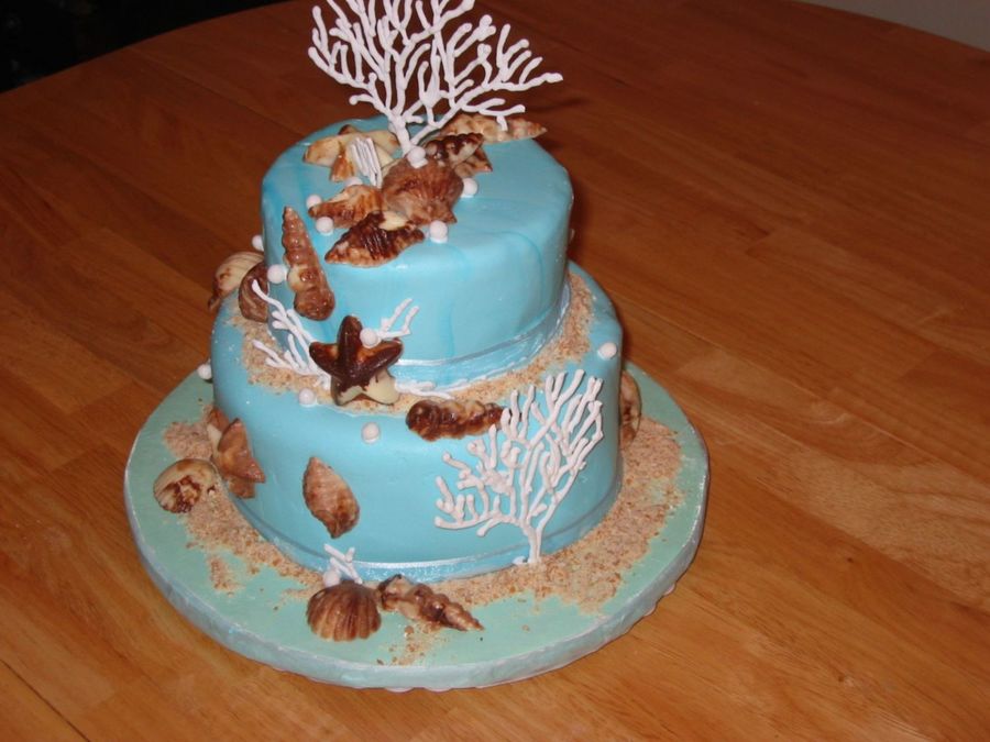 I just did this cake as a gift to my husband for our 2nd anniversary. The top tier is white chocolate with white chocolate buttercream. The bottom layer is lemon with raspberry preserves filling and buttercream frosting. It's covered in fondant with fondant pearls, royal icing coral (from pattern on CC) and white/milk chocolate shells (first time making them). Was inspired by several shell/ocean cakes on CC.