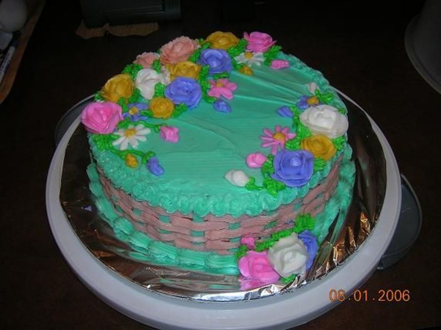 This is a cake I made in my Wilton Classes. When I made this cake the air conditioner wasn't working in my house. So the icing kept melting on me :(
