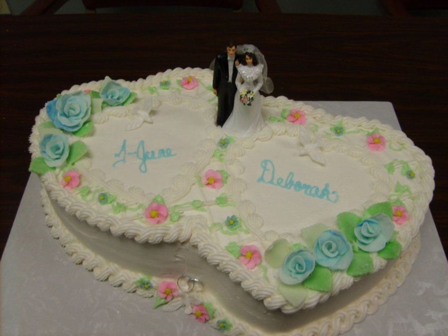 Great job on the cake. Love the borders and the roses. I like the idea of the hearts together. It is nice for a small wedding.