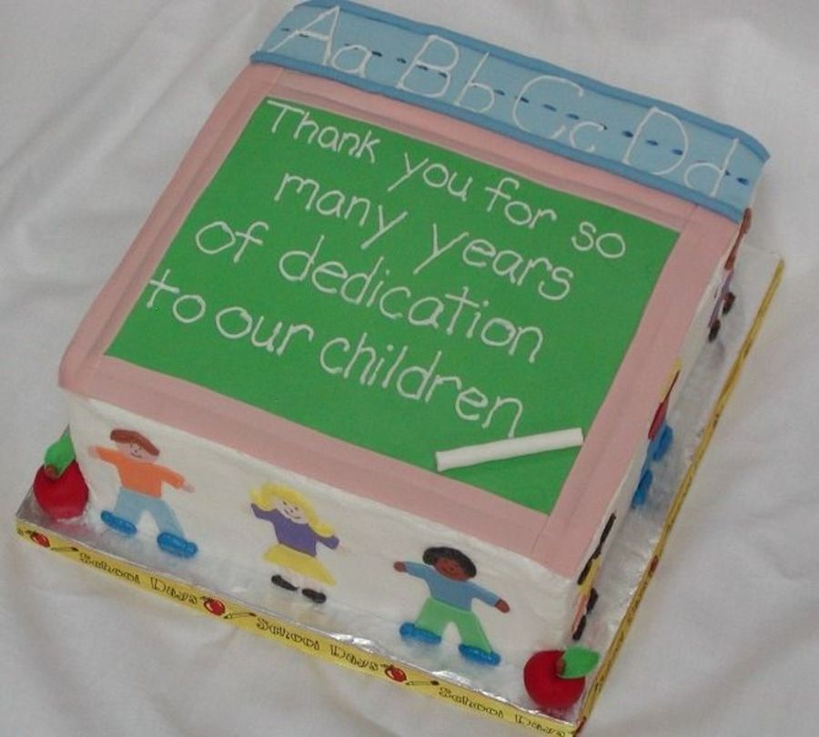 This was made for an end of year class party where the elementary school teacher is retiring. Inspiration for the design came from a cake done by Jen123. Buttercream with fondant accents (kids, chalkboard, apples...) I'm pretty happy with how this one turned out.