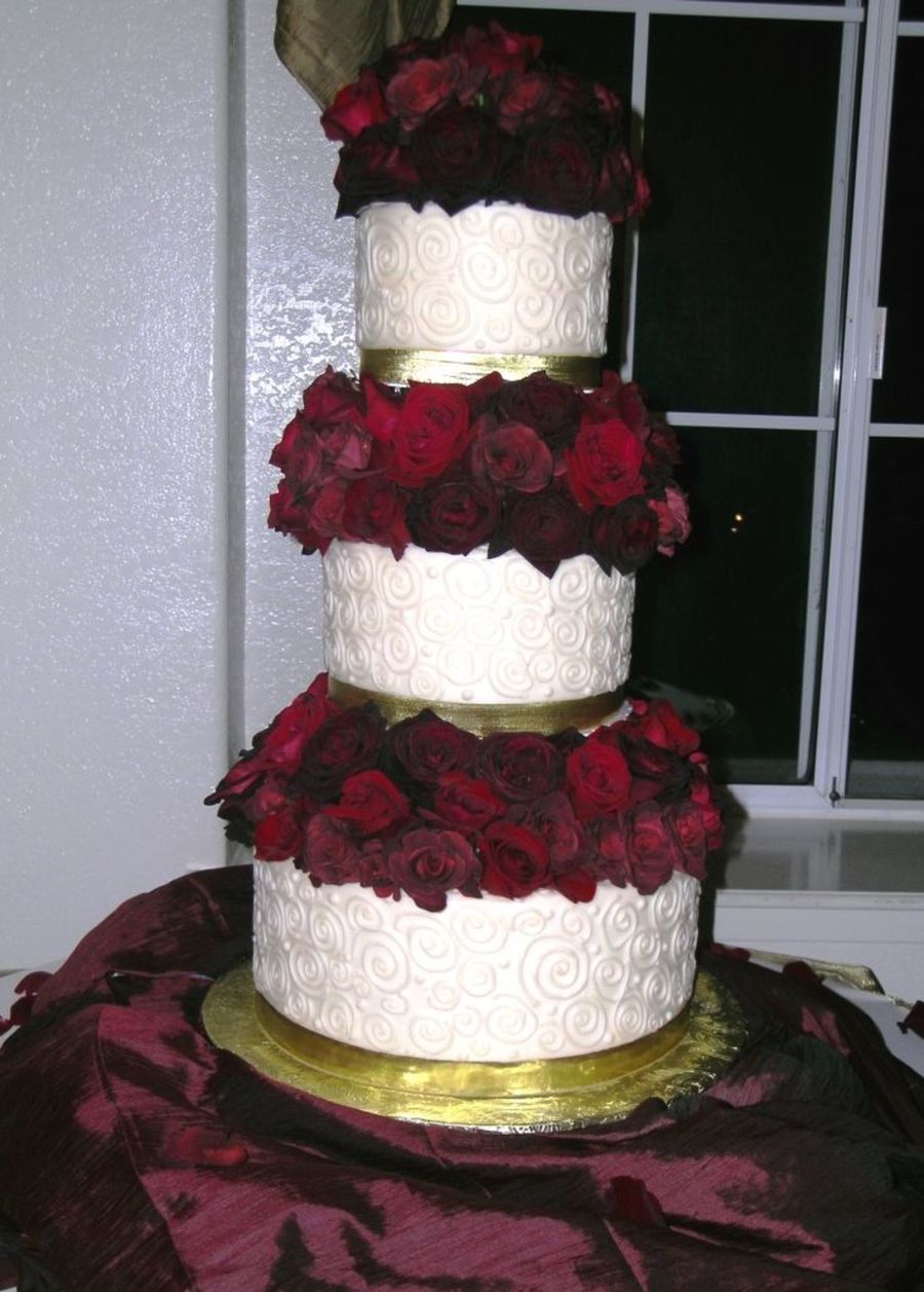 My friend asked me to do this cake for her, because she was planning her wedding in one week! Its a 12, 9, and a 6, made with B.C., Chocolate cake and chocolate mousse, tons of roses and gold ribbon at the base.