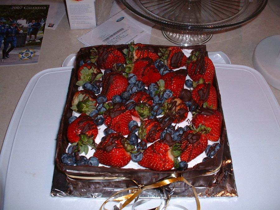 This was a cake I did for my boss's birthday. It was chocolate cake with strabwerry filling iced in BC. I melted chocolate in my cookie pan and cut out pieces to put around the sides to make it look like a box. I put fresh berries in the top and drizzeled them with melted chocolate. Of course it didn't come out exactly how I had envisioned it, I had problems with the sides melting as I was putting it together, but it sure did taste good!