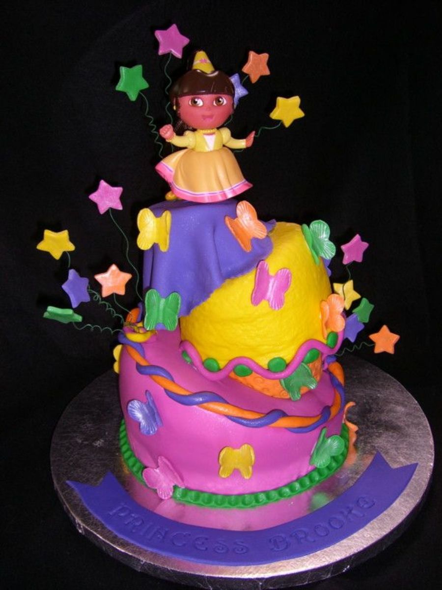 This cake was for my cousin's 3 year old daughter. She saw one of my Dora cakes and said she had to have her own, so this was my variation of my own creation. It had lot's of sparkle and she just loved it. White cake covered in mmf, gumpaste stars and butterfly's.