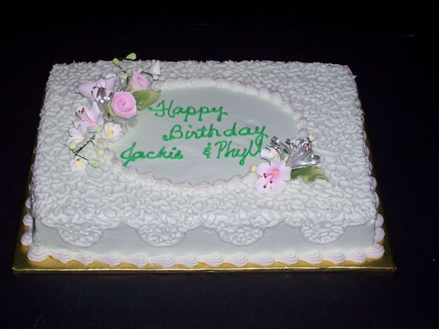 9X13 cake with gumpaste flowers purchased at ICES. Mist green BC frosting with wite cornelli lace.