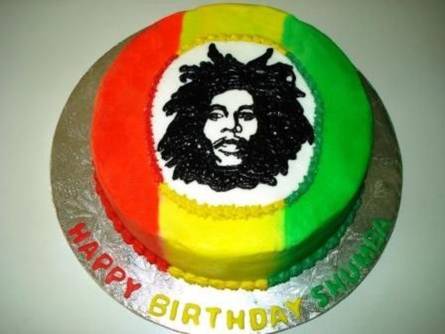 Cake made for a Bob Marley fan. Bob's face is done entirely in buttercream on a fondant plaque. The cake is sprayed with Wilton colour mist to get the red, yellow and green.