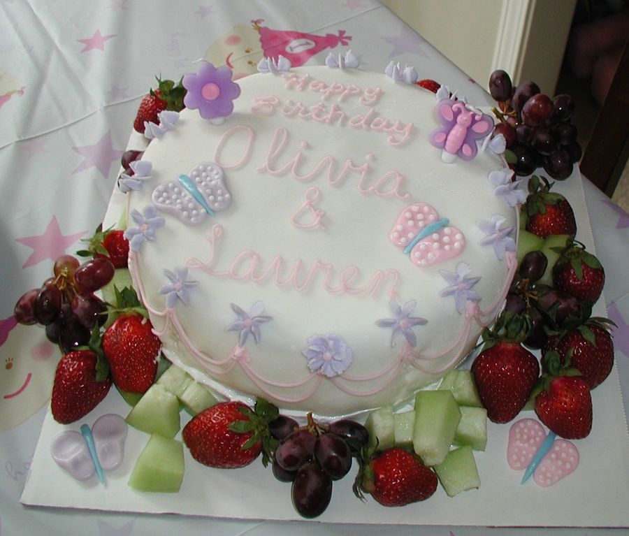 This was my first fondant-covered cake for my daughter's first birthday (and her cousin's 3rd birthday). I made the fondant from a gelatin-based recipe and it was a horrible experience. I literally stayed up all night working on it and vowed never to work with fondant again (didn't last long). An amusing memory is of my calorie-conscious sister eating a bunch of the fondant butterflies - I couldn't understand why she liked them so much.