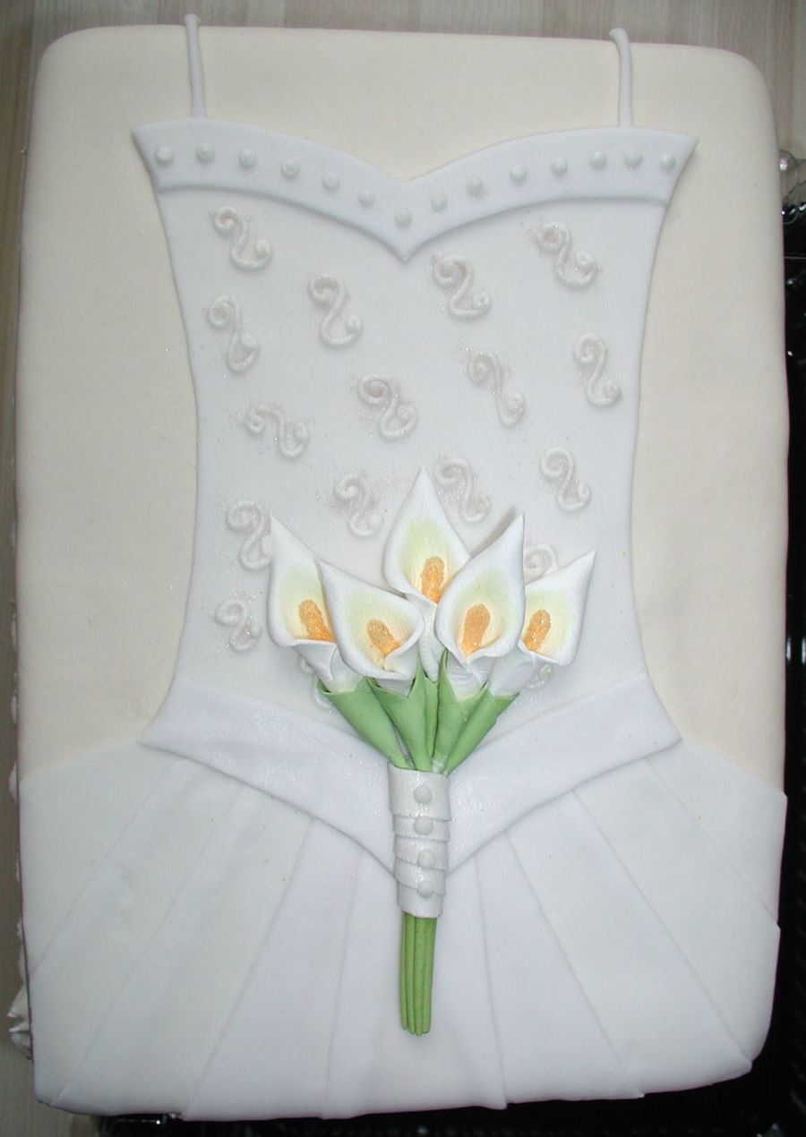 My friend threw a bridal shower and wanted a bride cake and groom cake to go with the bridal dress/tux theme. I used the shower napkins as inspiration and my friend wanted a bouquet of calla lilies on it. I tried several times to cover the cake with gelatin-based fondant and was ready to give up in tears. THEN I remembered my friend telling me about a cake decorating forum and I discovered CC, which led to MMF, and FINALLY a finished cake that I was happy with. Fondant calla lilies.