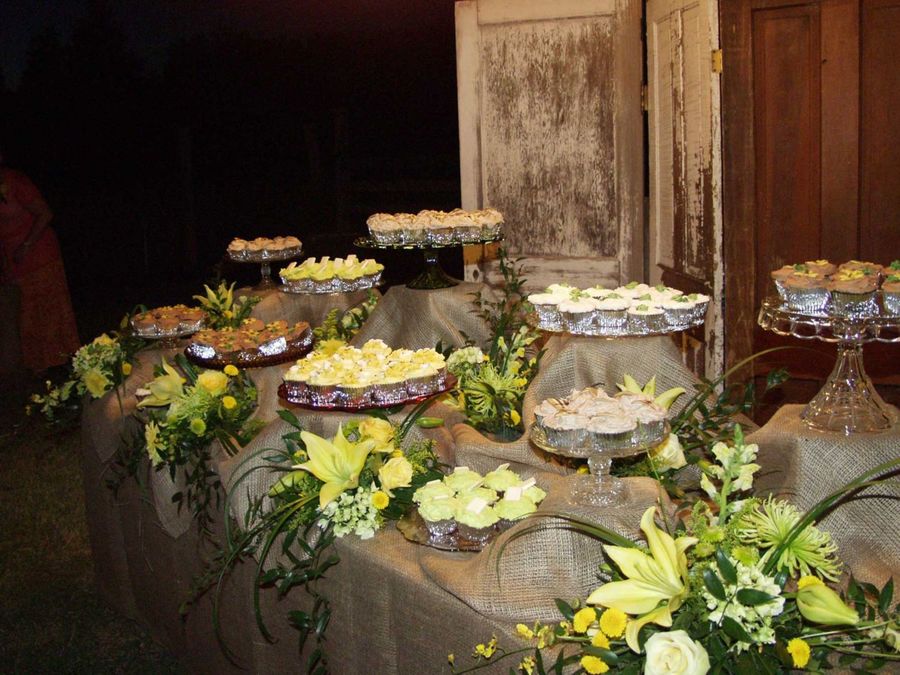 Serving table for wedding that served 29 dozen gourmet cupcakes. Five flavors....each decorated to coordinate with the wedding decor/color scheme. Handmade fondant/royal/gumpaste/and white chocolate decorations for each. Ourdoor wedding. Will follow with more submission for closer view of some of the cupcakes.