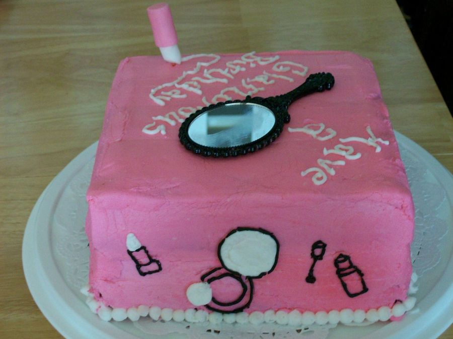my first paid cake, not sure how well it turned out, but i had fun making it the ladies that ordered it only said make it pink and have a dimond and glasses on it. I had each side be three diffrent things this is the cosmetic side, the top writting ended with a fondant lipstick and the mirror i purchased at a yen store as i can't find silver dust on this island, Please tell me what you think or i should have improved thanks so much