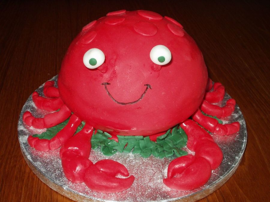 I used my ball pan and covered it with bc as a base layer and mmf on top. I used a colouring picture I found as my inspiration. The seaweed and crab are all mmf. I used spaghetti to support his eyes which are on little stalks. This cake is for my work's summer fair and I hope the children are going to like it.