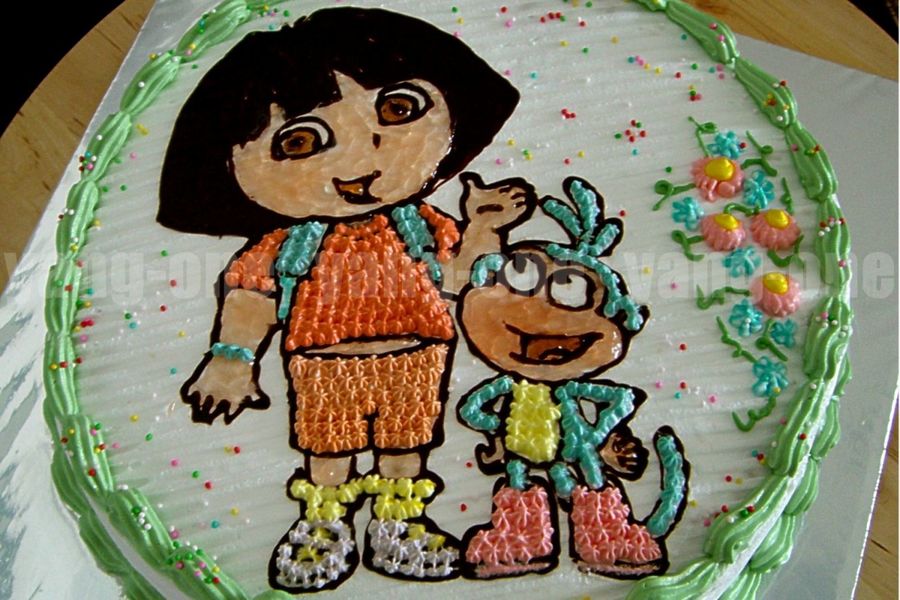 I made this for a friend's 2 year old boy who loves Dora. I use chocolate for the outline & hair. Non-dairy whipping cream for the rest.
