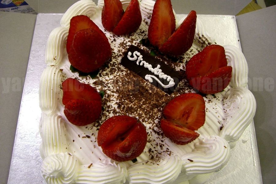 Simple chocolate cake with whipped cream piping and strawberries