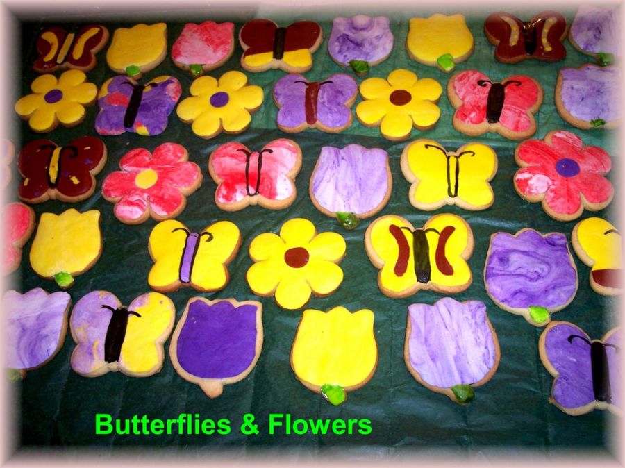 simple butterflies and flowers done last minute for my daughters b'day at shcool. Cookies are covered in fondant. TFL