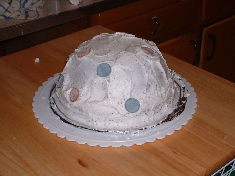 I made this cake for my daughter's PreK class when they were studying space. I used a round pan and a bowl for the dome. The "craters" are Necco wafers. The cake is chocolate and I purposely had crumbs in the icing.