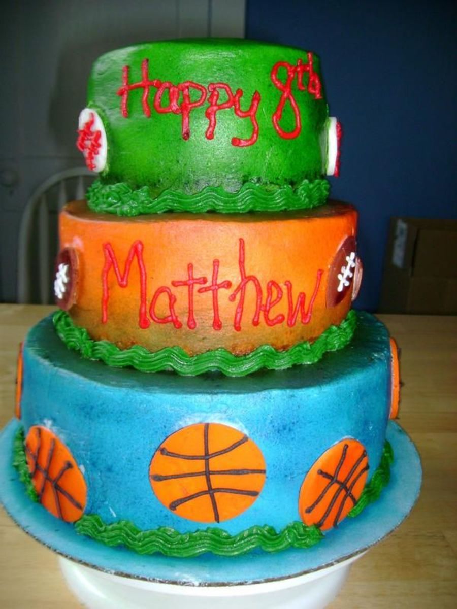 This was my son's 8th birthday cake. All cakes were double layer: 10" chocolate, 8" yellow and 6" strawberry all filled and iced with buttercream. Color was airbrushed and sports balls were all MMF.