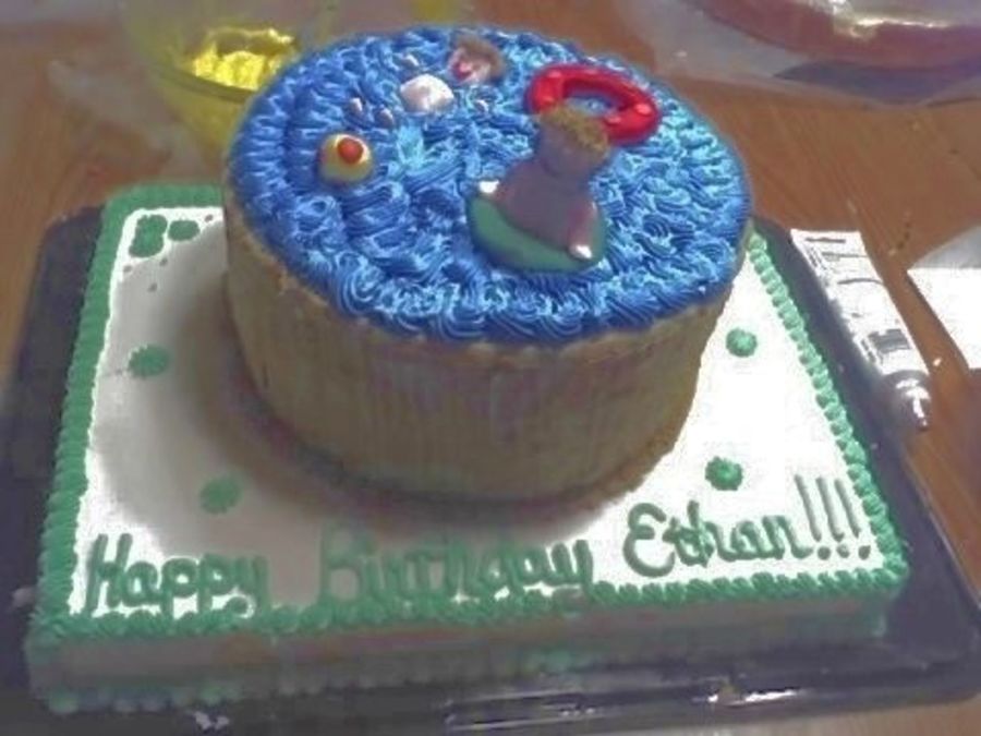 My son's birthday cake. It's a10 inch Neapolitan cake on top of a white sheet cake. The people and pool toys are made of fondant and the rest is buttercream.