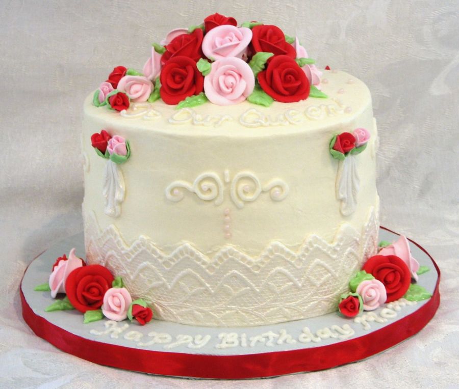 Chocolate cake w/cookies and cream filling iced in buttercream. Royal icing roses and leaves. Fondant lace and swags.
