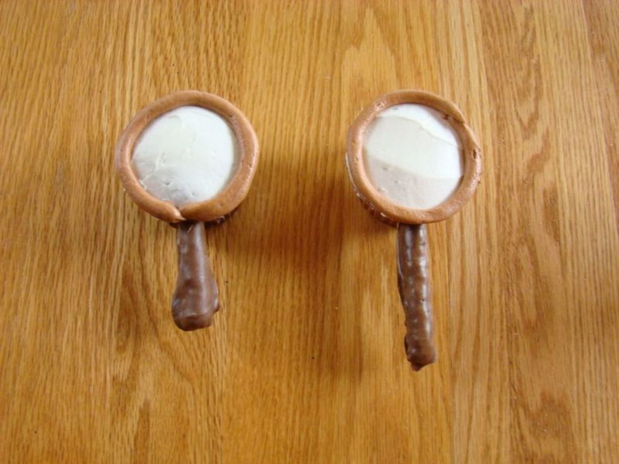 I made these cupcakes for my son's Vacation Bible School. The theme was Secret Agent. Thanks to my sister juds2323 for helping me out with the idea. The cupcakes are iced white, then I piped a brown circle on top of the cupcake, and hand dipped pretzle Rods in chocolate for the handles.