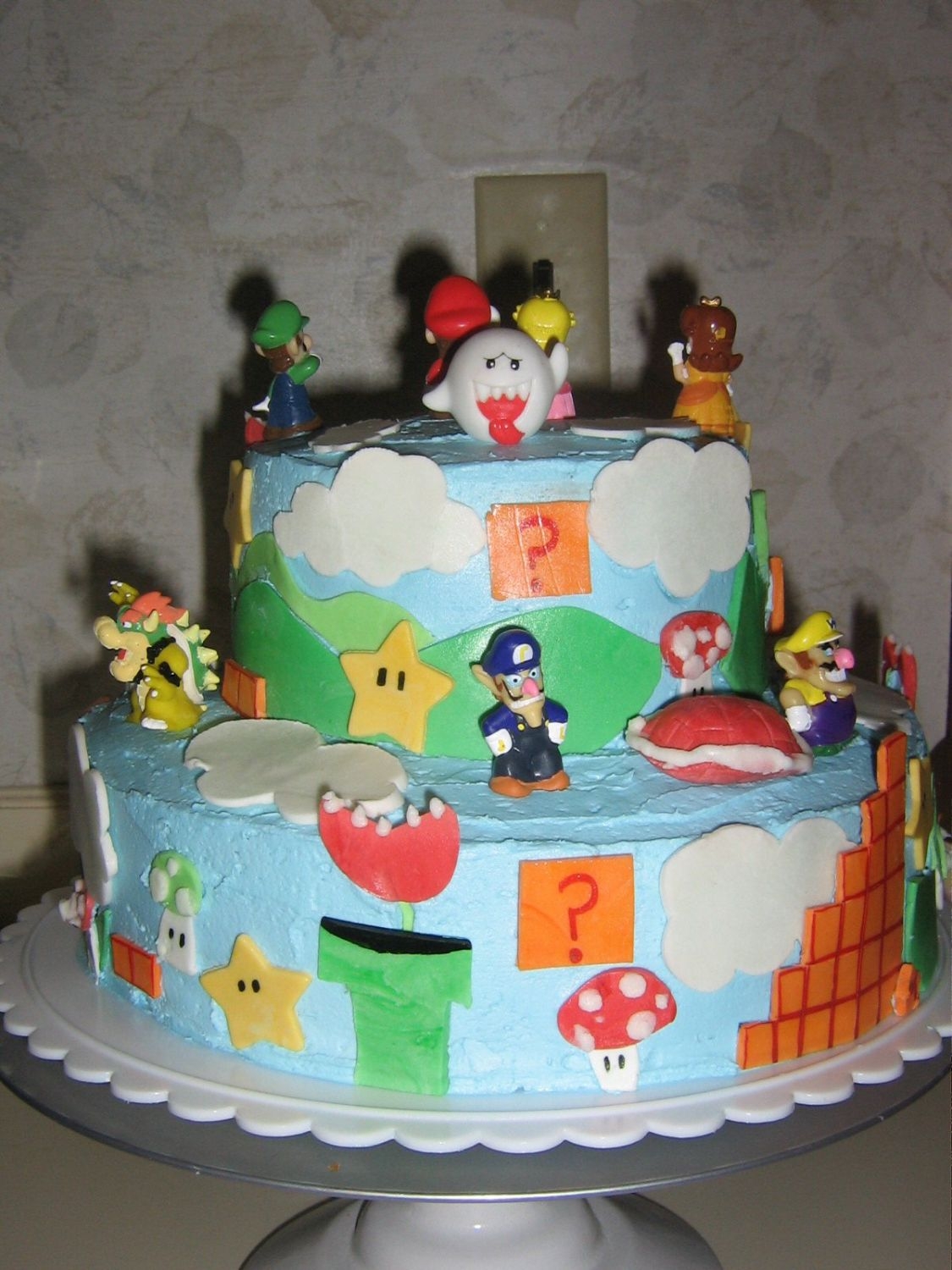 Nintendo birthday cake made for my daughters 8th birthday. Accents made from gumpaste and characters were ordered in from Hong Kong.