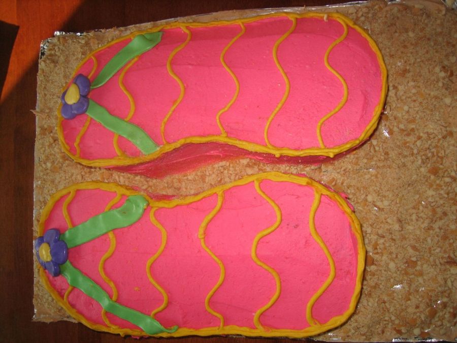 I made this cake for my staff at school on the last day. It was a half sheet cake cut into 2 flip flops. I used a template I made. I frosted it in buttercream and the decorations are made with MMF. Everyone loved it (and nobody wanted to cut it)