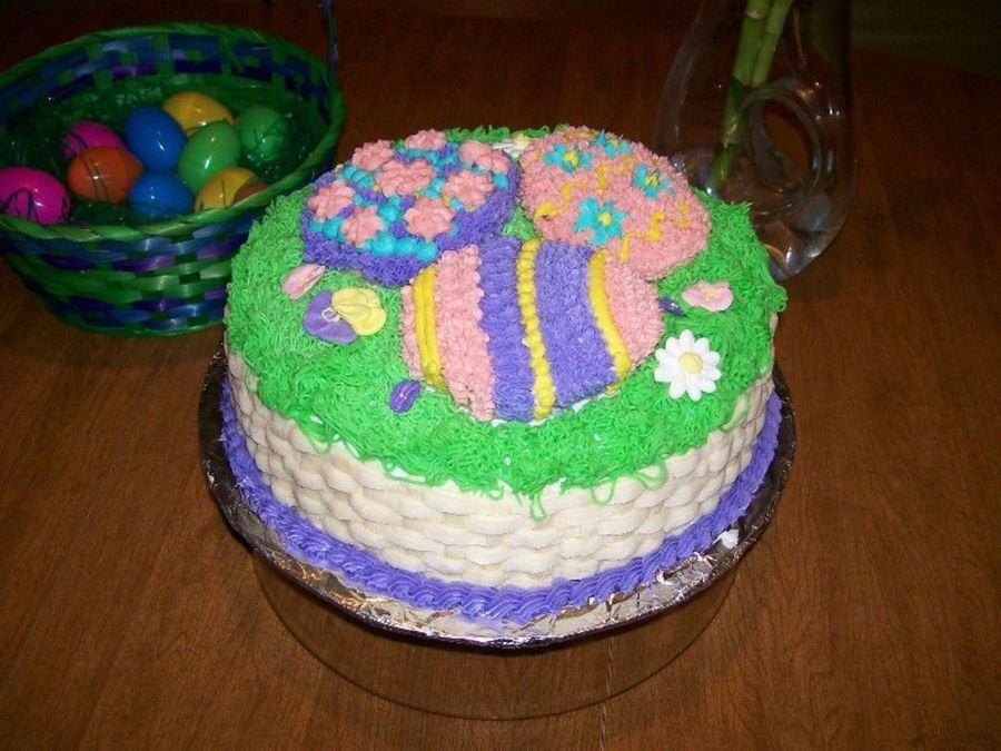 Basketweave on the side. Eggs are done by cutting them out of a larger cake. Completely done in buttercream.