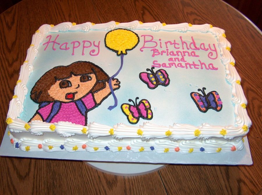 1/2 sheet, bc frosting with Dora & butterflies filled in with star tip (transferred with piping gel)