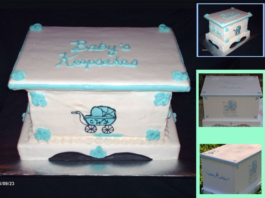 This was very challenging for me, and it was for the owner of my husband's company, so no pressure! A cake to match, as closely as possible, the Keepsake Box shown in the two small inset pictures framed in green). The base and lid are cardboard wrapped with fondant. The cake is three stacked 8x12's. The carriage on front was going to be a FBCT, but it fell off!! So thanks to my wonderful sister for sugggesting a fondant cutout in blue, then piping in the details.