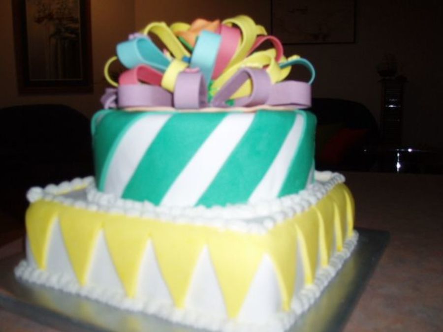 Had a go at the bow, not quite happy. Next time will do them wider. This was fruit cake on the bottom and chocolate cake on top. Also first time at doing the triangles/stripes on top of Royal Icicng. I'm having fun, and my family are enjoying it too!