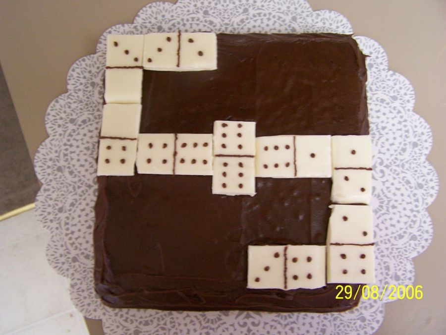 This was a chocolate cake with chocolate icing and candy melts made to look like dominos.