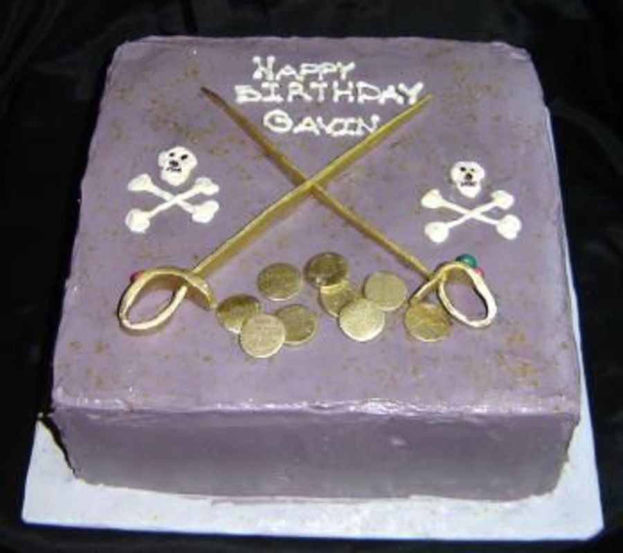 10" square cake with buttercream. This is what color I got when I used super black, kind of a weird purple, very disappointed. Swords and coins made of gumpaste.