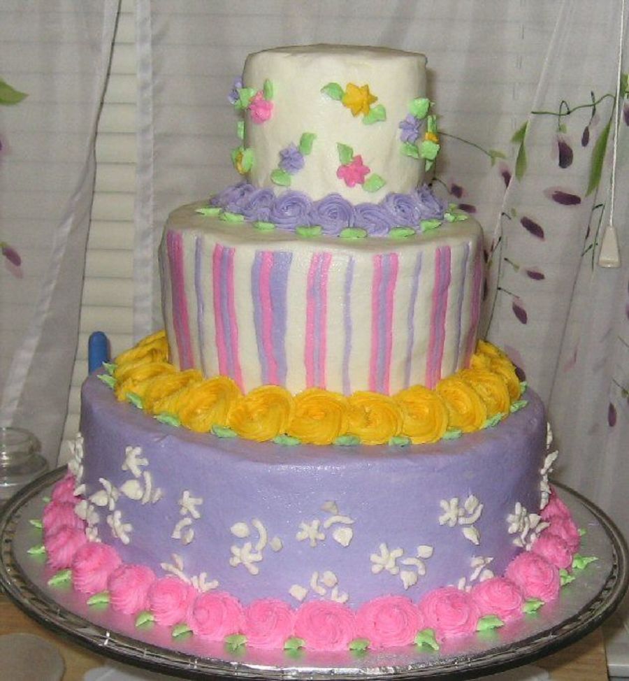 I always forget to give the details :oops: This was all buttercream, bottom 2 tiers were half chocolate raspberry, half coconut yellow cake, top was all coconut yellow cake. The tiers were 3", 6", and 9".