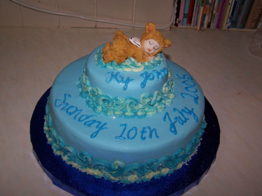 this is my 2nd christening cake, the bottom layer is a rainbow vanilla, with a choc fudge top layer, covered in buttercream and fondant, with a resin teddy bear on top. was loved by all.