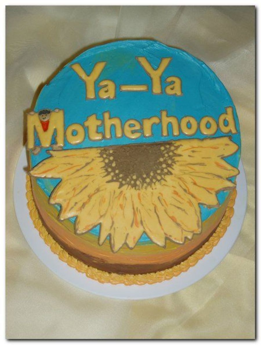 I did this cake for my MOM's Club Banquet. It was a "Ya-Ya Motherhood" theme w/ sunflower decorations. The cake was golden butter w/ strawberries & cream filling, iced w/ buttercream. The sunflower & letters were made w/ royal icing.