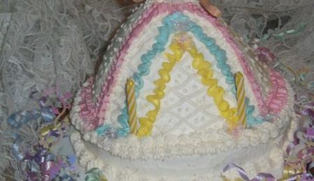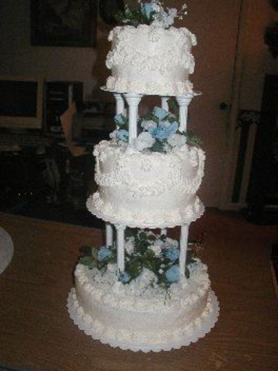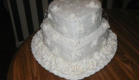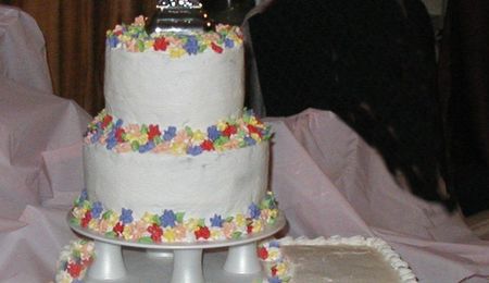 Small wedding, butter cream icing on yellow vanilla layers. Silk flowers.