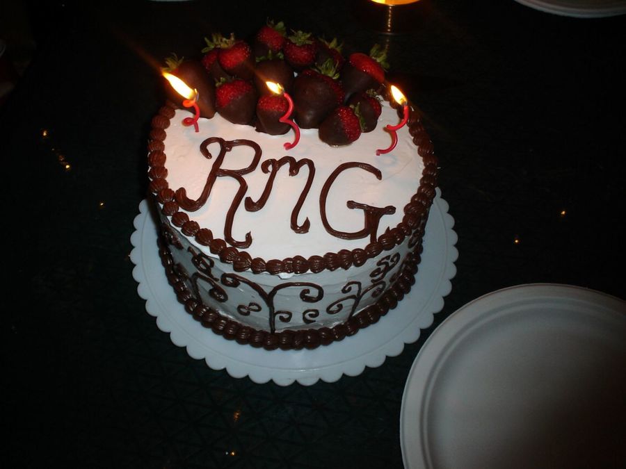 I made this for my husbands 25th bday, and it is a 2 layer german choco cake with white buttercream, and chocolate dipped strawberries. my first attempt at the upside down icing technique, and my first scroll decor. Everyone loved it. This is only the 3rd cake I have decorated (in a begginers professional way :) )