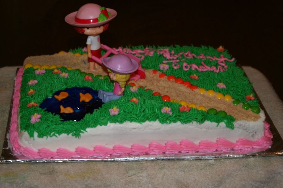 As with my Dora cake, I used a cake I had seen on here and added my own flair to it to give my 5th garders teacher's little girl a special birthday cake. I used piping gel for the water, placed baby Goldfish crackers in the pond, vanilla wafer crumbs made the path. I bought the figures off of Ebay.