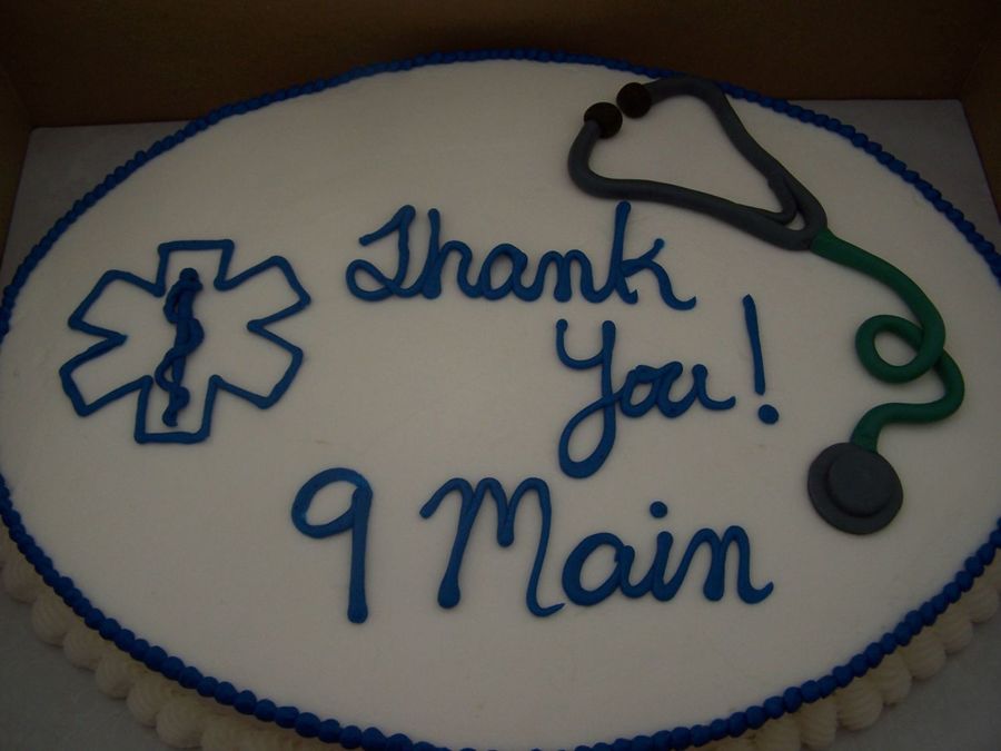 Cake done as a thank you for hospital staff after the customers son was in the hospital. Red velvet cake, BC icing and fondant stethoscope.