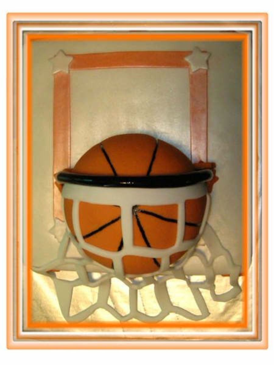 This cake was created for an Allstar Girls BB team! Yes! Their colors are Orange and White! LOL!!! The backboard cake is an 11"x15" vanilla cake with raspberry filling, covered in MMF. The basketball is the wonder ball pan with orange rum cake with lemon filling, covered in MMF. The net/basket is MMF, too! It was easy and fun to make.