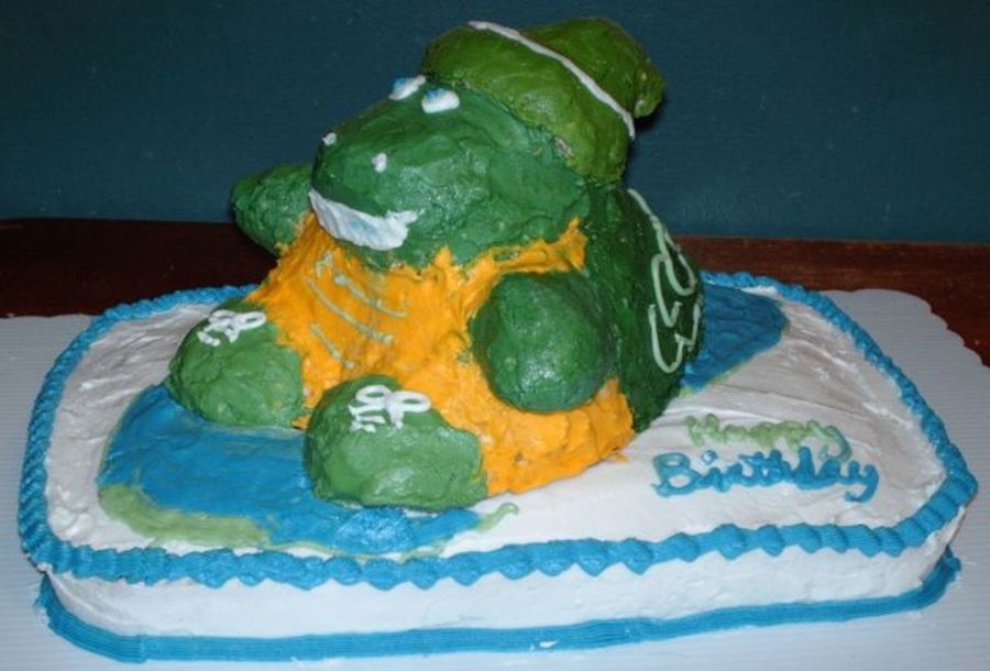 This is a cake I made for my husband's birthday. He loves to snowboard and has always liked turtles so I decided to try to make a turtle on a snowboard. Only it didn't quite turn out like I pictured. I made the turtle out of rice krispy treats and have since learned to let them cool a bit before sculpting with. Being warm, they squished down so it looks more like a dinosaur than a turtle. And then I didn't take the time I should have so it doesn't really look like a snowboard, either. But that's okay.