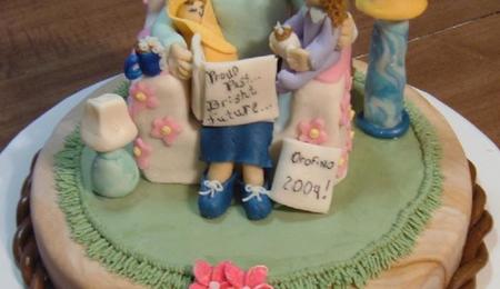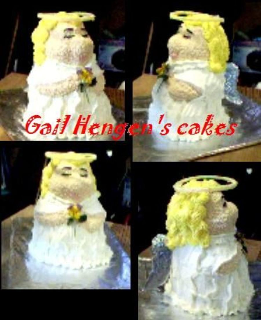 I'm sorry these are so small; the full size pics are misplaced after all these years thats not suprising. I used a winnie the pooh pan; margarine tub lid coated with bc and edible glitter; real pansy from my garden placed in the angels hand and my step dad got my mom a new ring also placed in the angels hand. unseeable as the pics are too small.