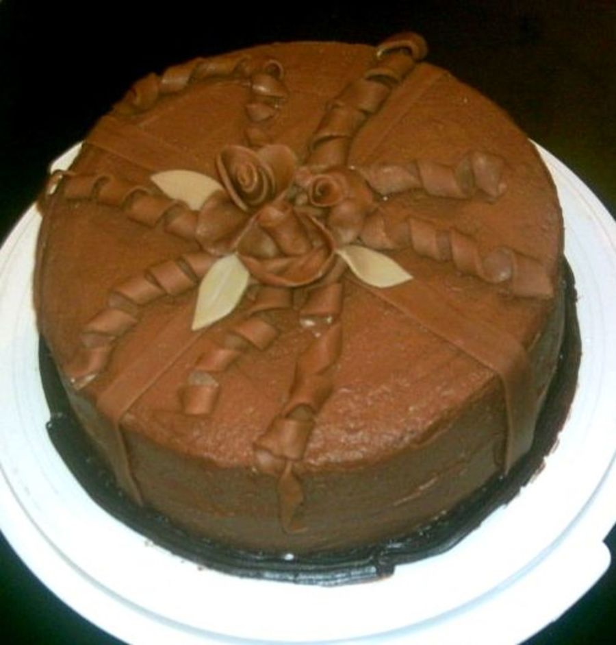 This is two 9-inch devil's food layers with chocolate fudge filling and chocolate buttercream icing. I made MMF with cocoa and curled spirals around a sports bottle straw. The fondant flowers are kind of amateur. I need practice on those. This was for an 11-year old girl's birthday - she said she wanted chocolate.