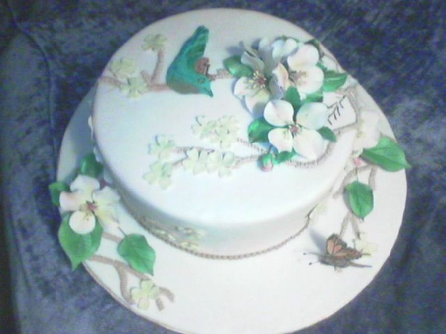 Fondant covered cake; "satin embroidered" shrub; bas relief bird (a dark blue bird which appears greenish in the photo), gumpaste wild rose, gumpaste leaves; painted gumpaste butterfly.