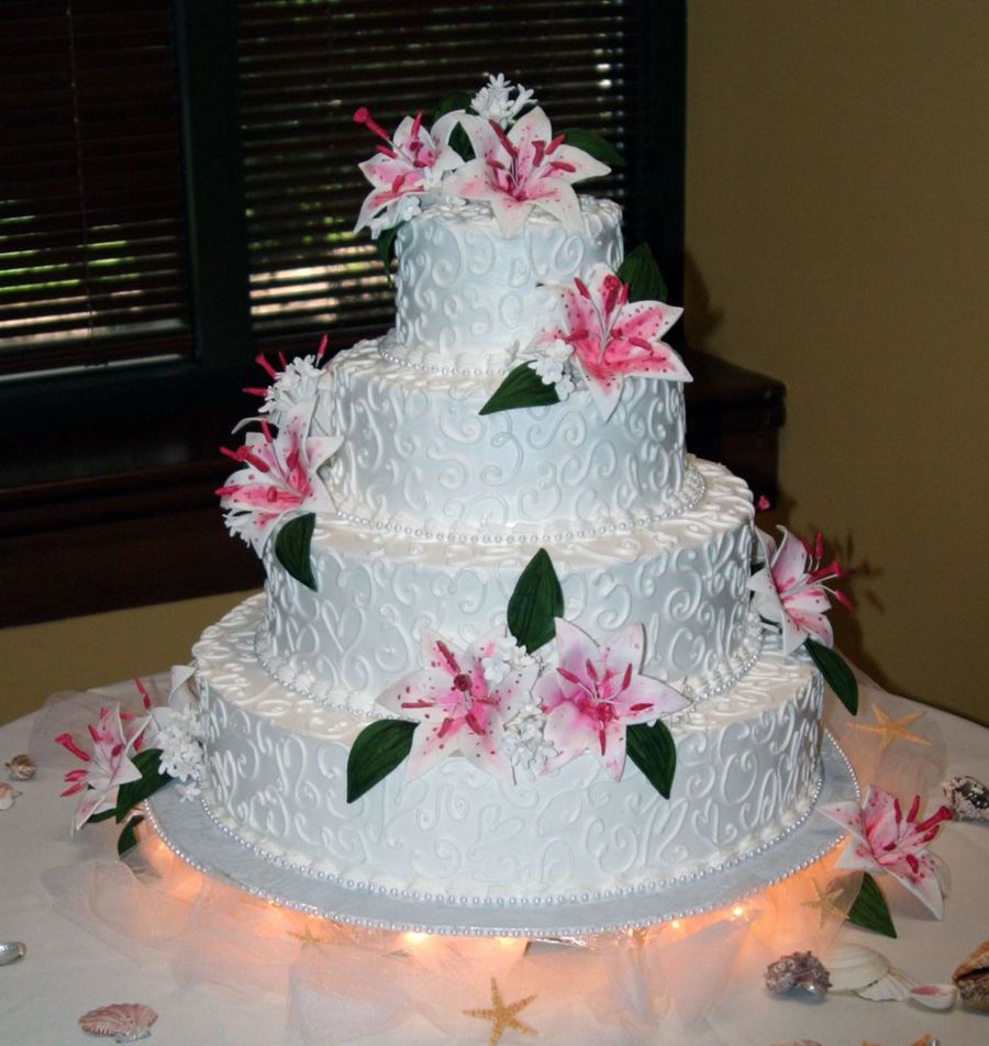 Couple married in maui, reception in all tropical theme. Cake done in our sig. scroll work, gumpaste lilies in HOT pink! Shells scattered around base were real.
