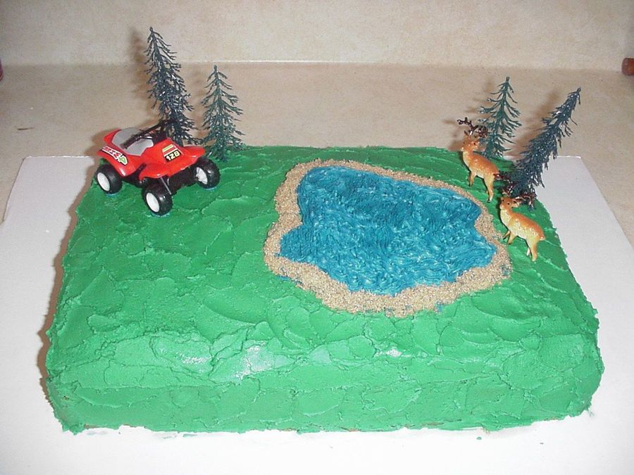 It's a single layer yellow cake with buttercream icing. I used brown sugar for the sand around the lake. This was before we wrote "Happy Birthday" on it in brown icing.