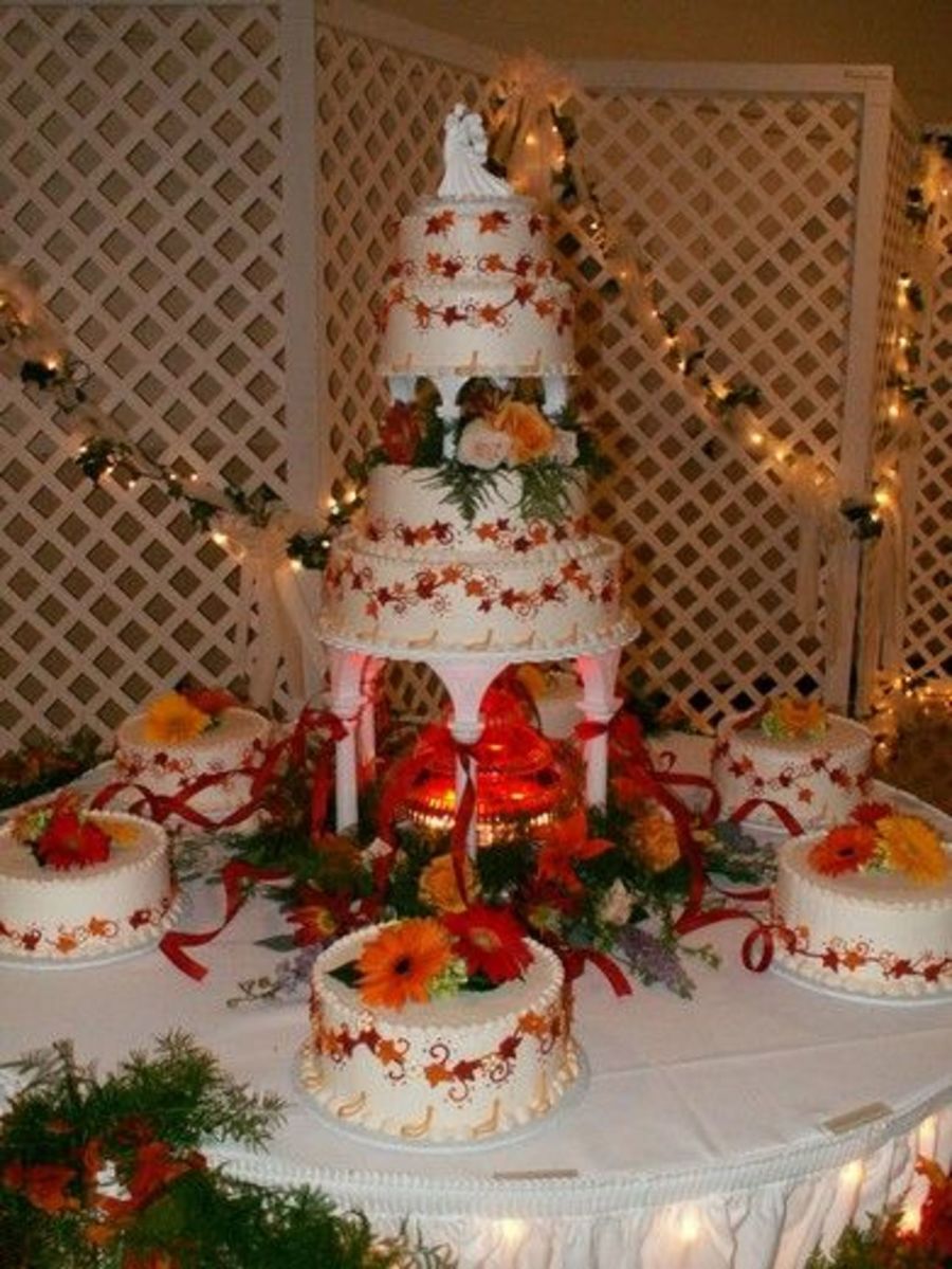 This was a very large wedding; just about killed me! There were 11 cakes in all. All of them were different flavors! The biggest cake weighed in at about a hundred pounds. (kidding) It took me and my husband and the florist to get it on the posts! The leaves were MMF and the tiny flowers were royal. The buttercream was tinted ivory.