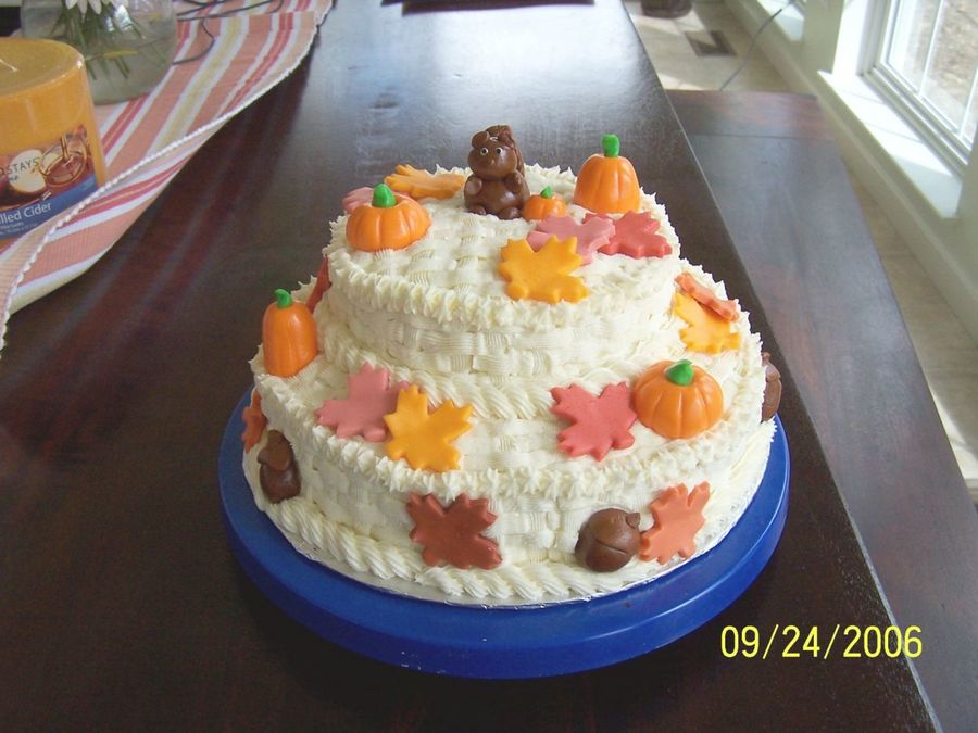 This was for my mom's birthday. She loves basketweave, and also wanted fall things, so I added leaves, pumpkins, acorns and my squirrel! Chcocolate cake, buttercream icing, and decorations are rolled buttercream.