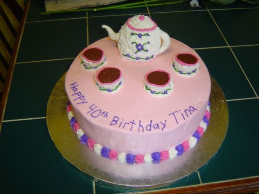 What a pretty cake. I am sure your sister liked this better than a tombstone! Nice teapot.