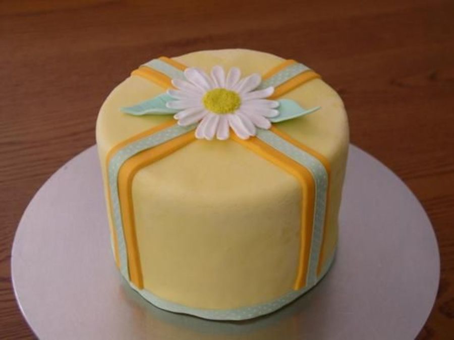 6 inch cake with fondant and gumpaste accents. The green ribbon is real. The fondant looks mottled (but isn't) because there is frost on it. I froze it to ship to NY to my sister along with my cherry blossom cake. Amazingly they made it in one piece!