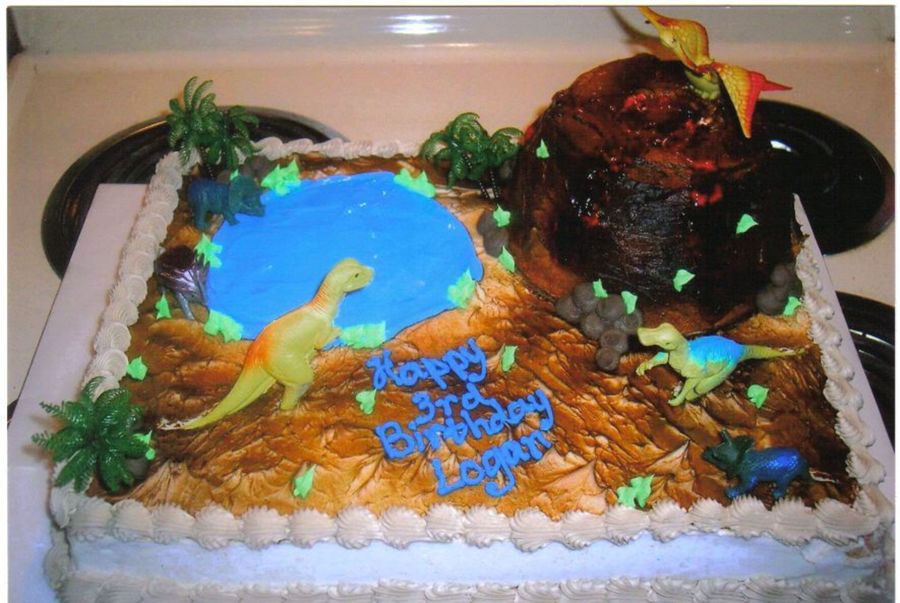 This is a white sheetcake with a chocolate volcano. Buttercream iced and I used gel for the lake and lava. I also used plastic dino pieces and for the trees.