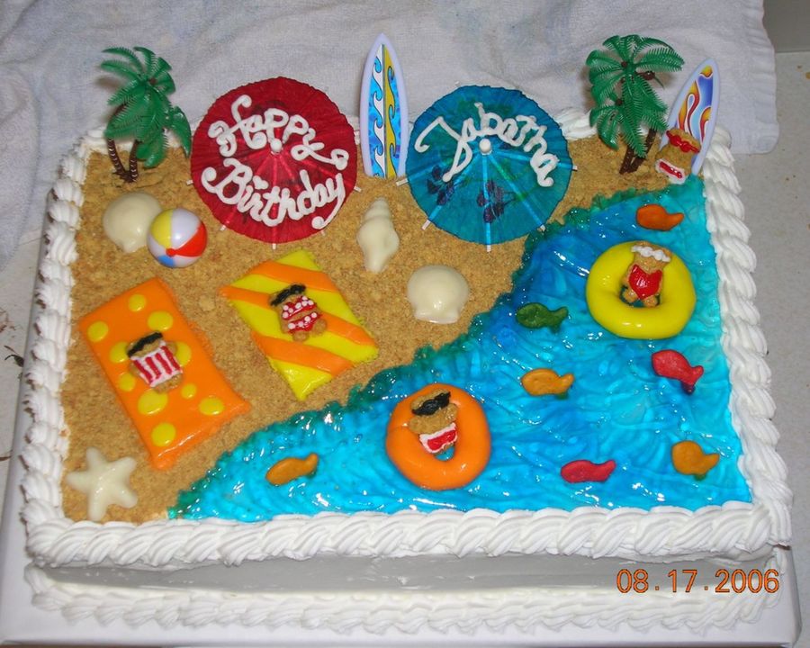 Quarter-sheet yellow cake with buttercream frosting. Teddy Grahams with bathing suits/sunglasses piped on. Innertubes and towels out of MMF. Shells made from melted almond bark. Water made from piping gel colored royal blue. Beach made from crushed graham cracker crumbs. Thanks for looking!